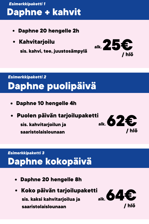 Tutustu alta esimerkkipaketteihin kokoustilasta ja tarjoiluista. Kokouspalvelumme ovat räätälöitävissä asiakkaan tarpeisiin. Kysy rohkeasti tarjousta: palvelumyynti@forum-marinum.fi.